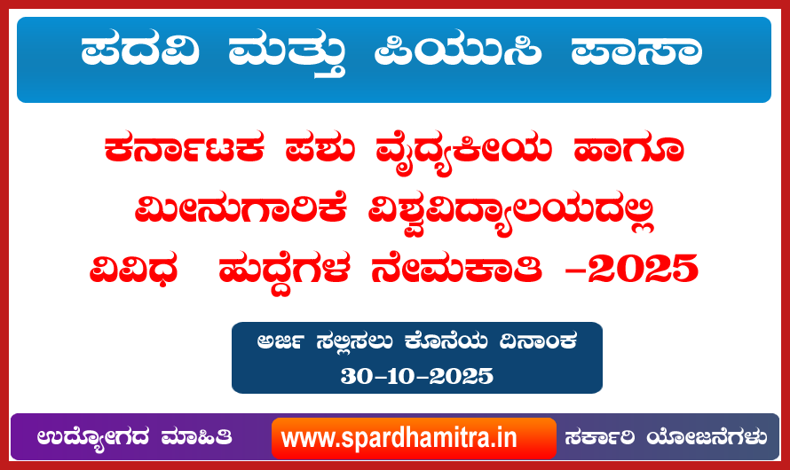 KVAFSU Recruitment 2025- ಕರ್ನಾಟಕ ಪಶು ವೈದ್ಯಕೀಯ ಹಾಗೂ ಮೀನುಗಾರಿಕೆ ವಿಶ್ವವಿದ್ಯಾಲಯದಲ್ಲಿ ಖಾಲಿ ಇರುವ ದ್ವಿತೀಯ ದರ್ಜೆಯ ಸಹಾಯಕ ಮತ್ತು ಸ್ಟೆನೋಗ್ರಾಫರ್ ಬೆರಳಚ್ಚು ಹುದ್ದೆಗೆ ಅರ್ಜಿಗಳನ್ನು ಆಹ್ವಾನಿಸಲಾಗಿದೆ. ಅನ್ ಲೈನ್ ಮುಖಾಂತರ ಅರ್ಜಿಗಳನ್ನು ಆಹ್ವಾನಿಸಲಾಗಿದೆ. ಅರ್ಹ ಮತ್ತು ಆಸಕ್ತ ಅಭ್ಯರ್ಥಿಗಳು ಕೊನೆ ದಿನಾಂಕ 03-102025 ಅರ್ಜಿಗಳನ್ನು ಭರ್ತಿ ಮಾಡಿ ಪೋಸ್ಟ್ ಮುಖಾಂತರ ಅರ್ಜಿಗಳನ್ನು ಸಲ್ಲಿಸತಕ್ಕದ್ದು.
