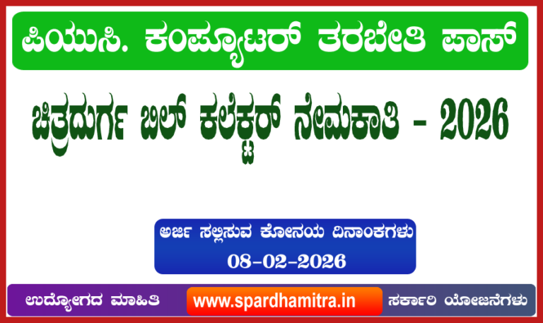 Chitradurga Grama Panchayat Bill Collector Recruitment-2026 ಚಿತ್ರದುರ್ಗ ಜಿಲ್ಲಾ ಪಂಚಾಯತ್ ವ್ಯಾಪ್ತಿಯ ಗ್ರಾಮ ಪಂಚಾಯತ್ಗಳಲ್ಲಿ ಖಾಲಿ ಇರುವ ಬಿಲ್ ಕಲೆಕ್ಟರ್ ಹುದ್ದೆಗಳಿಗೆ ಅರ್ಹ ಅಭ್ಯರ್ಥಿಗಳಿಂದ ಅರ್ಜಿಗಳನ್ನು…