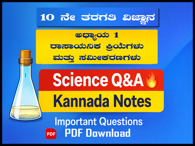 SSLC Science Lesson 1 Questions Answers -10ನೇ ತರಗತಿ ವಿಜ್ಞಾನ ಅಧ್ಯಾಯ 1 “ರಾಸಾಯನಿಕ ಕ್ರಿಯೆಗಳು ಮತ್ತು ಸಮೀಕರಣಗಳು” ವಿದ್ಯಾರ್ಥಿಗಳಿಗೆ ಬಹಳ ಮುಖ್ಯವಾದ ಪಾಠವಾಗಿದೆ. ಈ ಅಧ್ಯಾಯದಲ್ಲಿ ರಾಸಾಯನಿಕ ಕ್ರಿಯೆಗಳ ವಿಧಗಳು, ಸಮೀಕರಣಗಳು ಮತ್ತು ಅವುಗಳ ಸಮತೋಲನ ಮಾಡುವ ವಿಧಾನಗಳನ್ನು ಕಲಿಯುತ್ತೇವೆ.